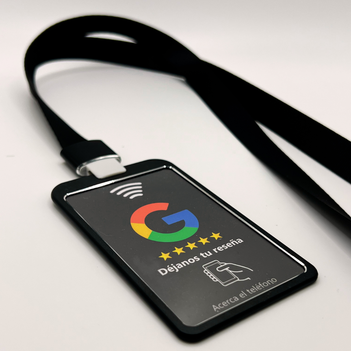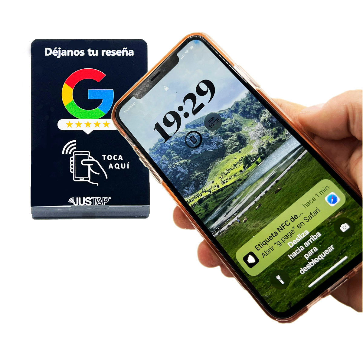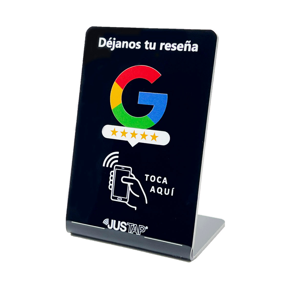 Gracias a la última tecnología NFC que utilizamos, nunca había sido tan fácil obtener reseñas. Con tan solo acercar el teléfono a 10 cm de distancia de cualquiera de nuestros productos JUSTAP®, conectarán directamente con la pagina de tu negocio para poder dejarte una reseña en Google.