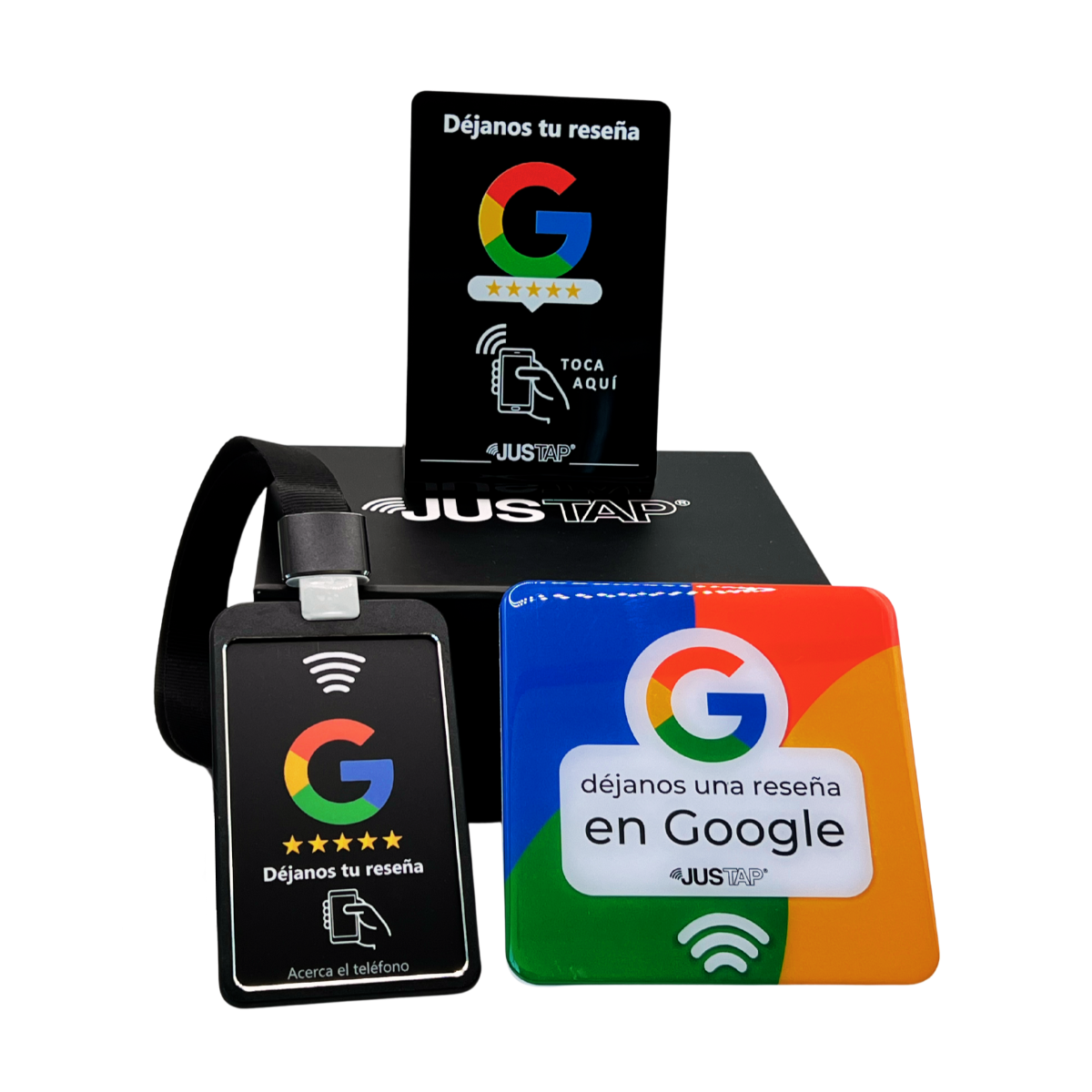 Llévate el pack completo de nuestros productos estrella JUSTAP® con tecnología NFC. Con este completo pack de productos JUSTAP, tendrás todas las opciones de que tus clientes puedan dejarte una reseña positiva de tu negocio si han tenido una buena experiencia sin ningún esfuerzo, y en cuestión de 3 segundos.